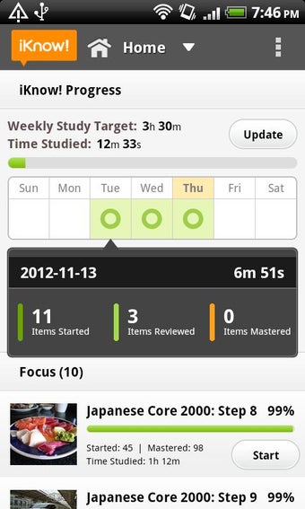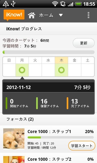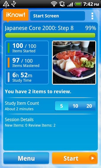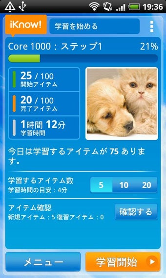 iKnow!のコースを選択後、「学習アイテムの確認」から学習する英単語リストを閲覧することができ、英単語をタップすると発音が聞けます。画面右下の「次へ」を選択すると、自分の学習時間に合わせて「学習するアイテム数」を5、10、20の中から1つ選ぶことができるので、画面右下の「学習開始」をタップして英語を学びましょう。どのコースも学習方法のバリエーションが豊富で、英単語とその日本語訳と例文が学べるのはもちろん、日本語訳から英単語、英語の音声のみから日本語訳を5択の中から選ぶ選択問題、日本語訳から英単語のスペルを入力する問題があり、英単語だけでなくスペルまで学べて便利です。