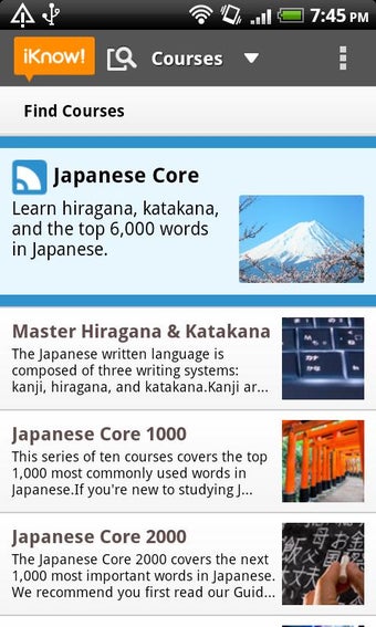 IKnow!を起動したら、まずは会員登録(無料)をして下さい。Eメールアドレスでの登録はもちろん、Google、Yahoo、mixi、Facebook、Twitterのアカウントでも登録可能です。登録後、「トラベル英語:入国審査&移動編」や「ビジネス基礎英語:初級1」などのコースの中から目的に沿ったコースを選択して下さい。これといった目的がなく、1から英語を学びたい人には「Core 500:ステップ1」のコースがおすすめです。